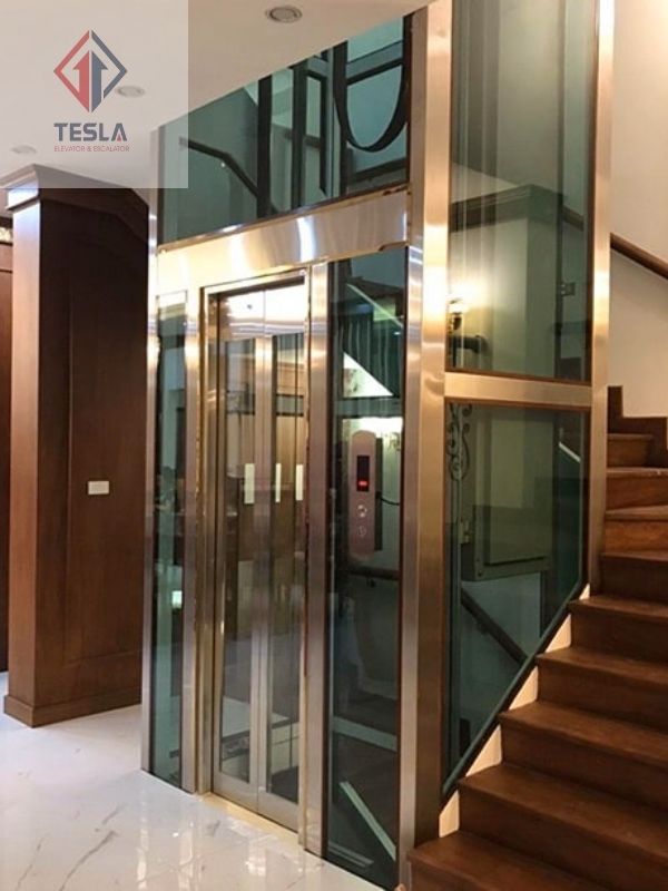 Giải pháp Tesla: Sử dụng mẫu Tesla Passenger 450 với thiết kế gọn gàng, hố thang tối ưu, cabin kính + inox sang trọng. Thang máy được lắp đặt tại vị trí góc cầu thang bộ để tiết kiệm tối đa diện tích sinh hoạt.